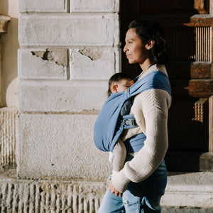 A wrap-style effortless buckle hybrid baby carrier.